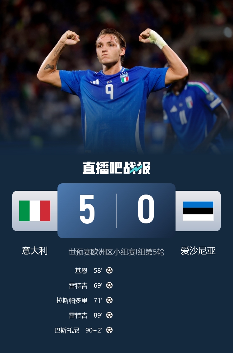 雷特吉双响,小基恩、巴斯托尼、拉斯帕多里破门,意大利5-0大胜爱沙尼亚。