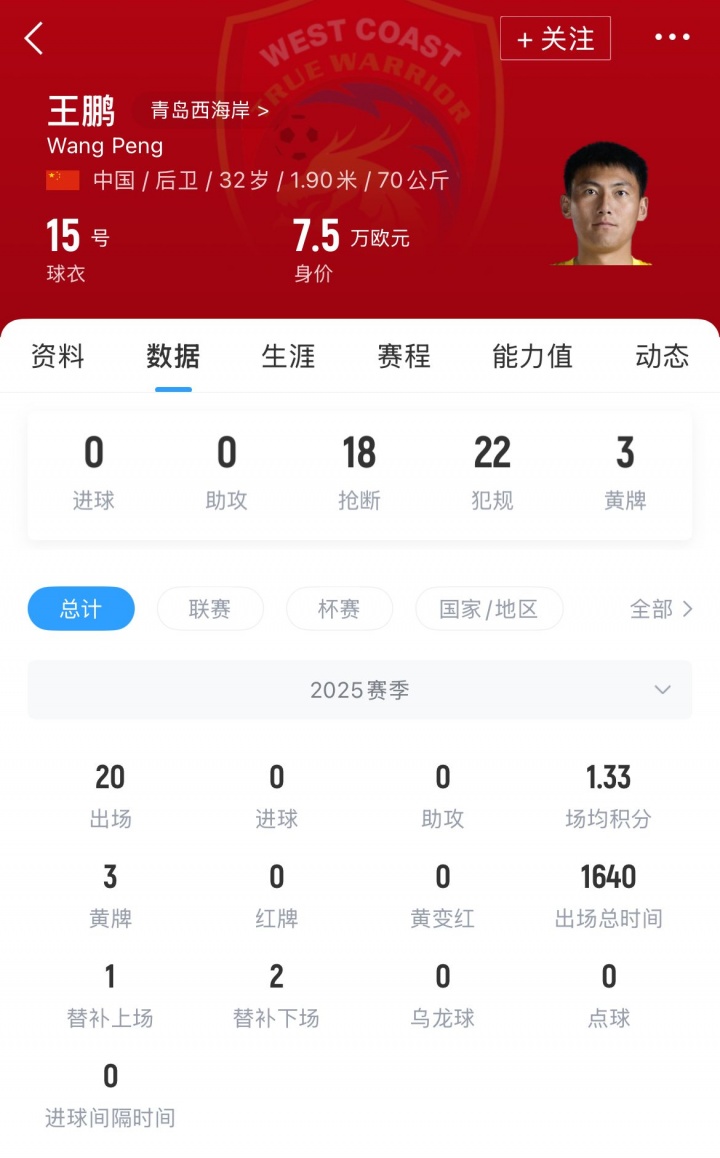 王鹏现年32岁,司职后卫,职业生涯曾效力于长春亚泰、沧州雄狮、深圳。