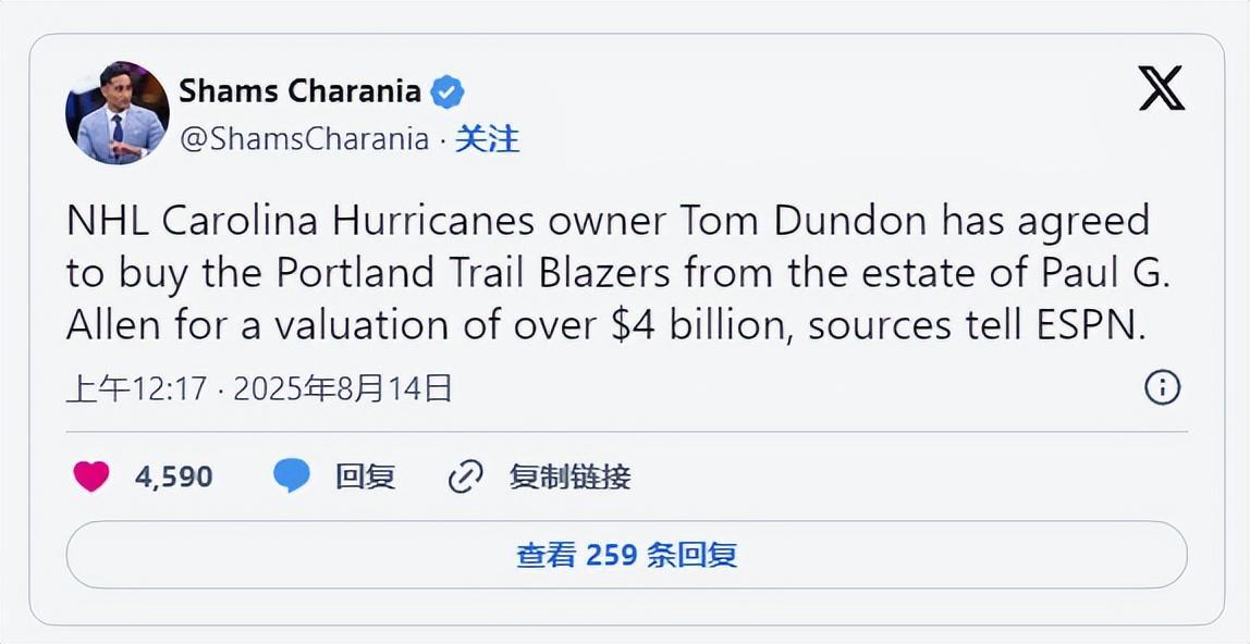 据NBA知名记者透露,商业大亨汤姆·邓顿以40亿美金完成对开拓者的收购。这位可能决定杨瀚森命运的新老板究竟什么来头?